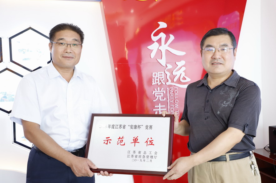 調研期間,陳健為集團公司榮獲“2018年度江蘇省‘安康杯’競賽示范單位”授牌,還為祝星星“勞模創新工作室”授牌。