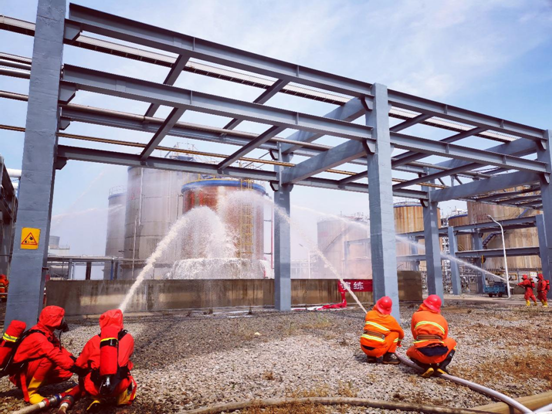 本次演練堅持從實戰出發,模擬中間罐區重芳烴泄漏發生火災,造成人員受傷。演練過程中,巡檢工在庫區周邊巡查,發現重芳烴儲罐出口管道泄漏,引起著火,立即打開重芳烴儲罐噴淋水,同時撥打119報警電話,公司迅速啟動公司級應急救援預案。指揮人員沉著冷靜,由該公司100余名員工組成的各個應急救援小組快速反應,到集合點集合,開展滅火、搜救行動??傊笓]許總向園區綜合執法局報告現已啟動公司級應急救援預案進行搶險,請求園區消防隊支援。6分鐘后,消防車抵達,與消防站長迅速對接,介紹火情,布置任務后。該公司搶險救援隊與園區消防大隊消防員密切配合,開展人員疏散、傷員搜救、大氣檢測、多角度水帶噴射泡沫滅火等操作。迅速控制了險情,圓滿完成了預定科目的演練。