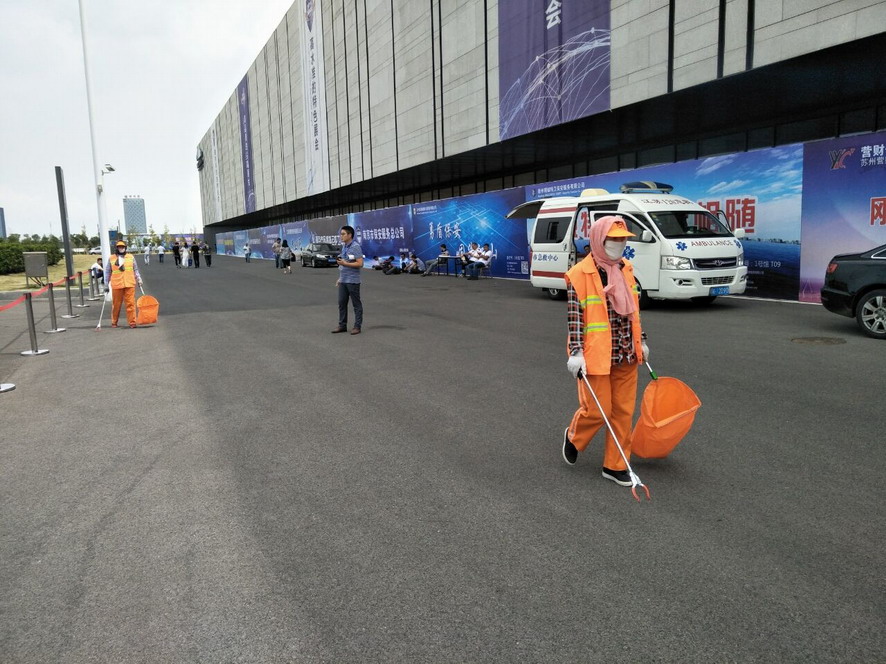9月14日,連續忙碌了兩個禮拜的職工們還沒來得及休息,便又投入到“連博會”的準備工作中去。由于本屆“連博會”共有來自27個國家和地區的420家企業參展,展覽總面積達3.7萬平方米,各家展商在布置展臺時,各類生活垃圾、裝修垃圾等一度將該公司布設的100多個垃圾桶都塞滿了,在安排好人工清理的同時,該公司還安排垃圾清運車對積存垃圾進行清理清運,組織灑水車對會場及周邊道路進行沖洗,一直到9月18日晚上9點左右才完成準備工作。19日“連博會”開幕當天,負責現場保潔工作的職工們早上6點多就趕到了會場,冒雨在會場周邊開始忙碌,一臺大型清掃車和一臺灑水車也在會場旁隨時待命。到了中午,當展商們在室內小憩的時候,室外的職工們為了不耽誤事,站在風口匆匆地扒拉兩口混雜著雨水的盒飯,就又投入到緊張的清理工作中去。僅19號開幕當天,累計清理各類垃圾7噸左右,為“連博會”的正常召開提供了一個干凈、整潔的會場環境。