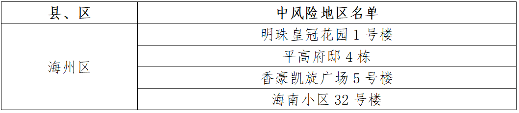 根據國務院聯防聯控機制有關規定,經市指揮部研究決定,自發布之日起,對我市部分區域疫情風險等級進行調整:海州區寶泰商住樓、同科匯豐國際A5號樓、御景龍灣D6號樓、香溢世紀花城小區20號樓、馨海名郡18號樓、馨海名郡2號樓、南極南路60-1號樓由中風險地區調整為低風險地區。其他地區風險等級不變。調整后全市現有4個中風險地區。