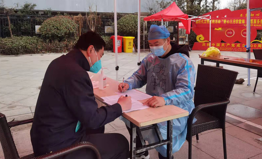 核酸采樣檢測高效完成?!熬用駛冋堊⒁?,咱們小區黃碼檢測點啟用了,請健康碼為黃碼的居民到這邊排隊,請大家佩戴口罩,有序排隊檢測?!薄敖鸱孔印敝驹刚吣弥群暗?。由于該小區部分樓棟被列為中風險區域,部分居民健康碼轉為了黃碼,為此,志愿者小分隊協助社區開設了健康碼“黃碼”人員核酸檢測專用采樣點,解決健康碼“黃碼”人員核酸檢測難的問題。他們從早上7點鐘開始一直堅守在核酸檢測一線,直到下午5點多鐘,終于結束了一天的志愿服務工作,脫下了防護服“戰袍”,肚子“咕咕”地鬧了起來,這才想起竟十幾個小時沒有喝水、吃飯、上廁所了。
