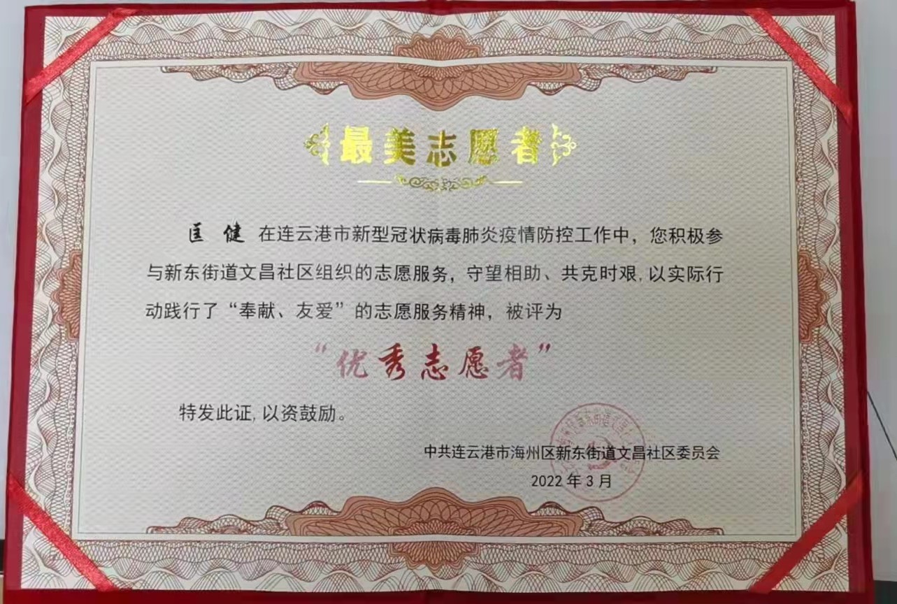 近日,公司黨員匡健、王長春分別被新東街道文昌社區、路南街道朝陽社區授予“最美志愿者”和“抗疫先鋒志愿者”。感謝他們在疫情防控期間舍小家顧大家,同舟共濟戰疫情、共克時艱同擔當,守護居民群眾的健康安全,為打贏疫情防控阻擊戰發揮了積極作用。
