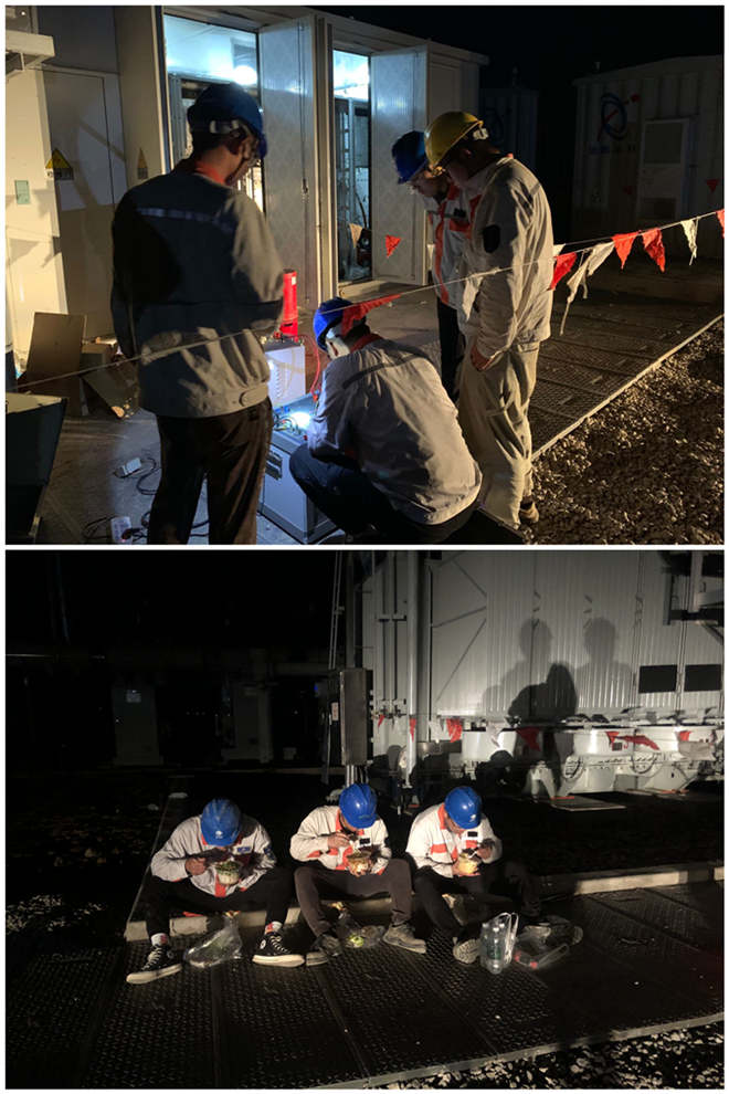 據悉,電纜耐壓試驗一相必須做滿一小時,做完兩根電纜耐壓試驗最少需要6小時。這意味著今晚將是個不眠之夜,面對這種情況,青年突擊隊隊員王程龍主動請纓,帶著王磊、祁明智、董毓帶上準備好的試驗設備二話不說奔去升壓站。升壓站附近環境惡劣,沒有路燈,只能用手電筒照明,且蚊蟲較多。在勘查過場地、熟悉工作任務需求、了解了有關注意事項后,他們熟練快速的連接調試好設備,開始做起了試驗。為了防止試驗過程中意外出現,幾人一直盯著設備,絲毫不敢松懈,一直鏖戰至凌晨5點,才順利完成試驗。(盧正遷、董毓)