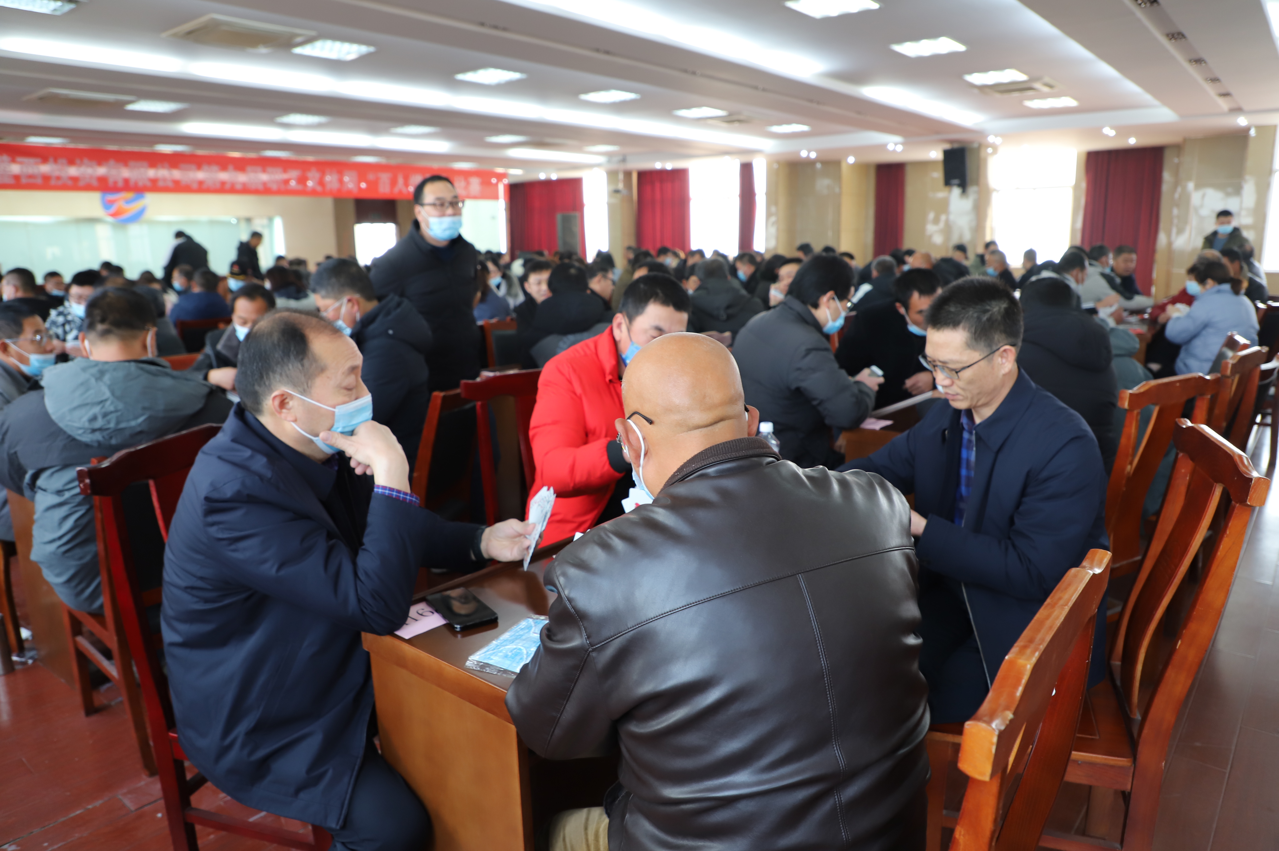 12月23日,灌西投資公司第九屆職工文體周摜蛋比賽在機關五樓進行,本次摜蛋比賽活動共計88對176名棋牌愛好者報名參加,為保證本次活動的公平公正,參賽人員采用分A、B組的方式,每個小組取前8名進入下一輪比賽;參賽選手經過3輪比賽后,獲勝的5對選手直接進入下一輪比賽,在輪空選手和5名敗方選手中取3名進入下一輪比賽,3名獲勝者進入下一輪比賽;進入16強的選手,采用抽簽方式確定比賽選手和順序,取前8名進入下一輪比賽;進入前8強的選手按對陣秩序依次決勝取出前八名;在淘汰的8名選手中按對陣秩序取出9、10名。
