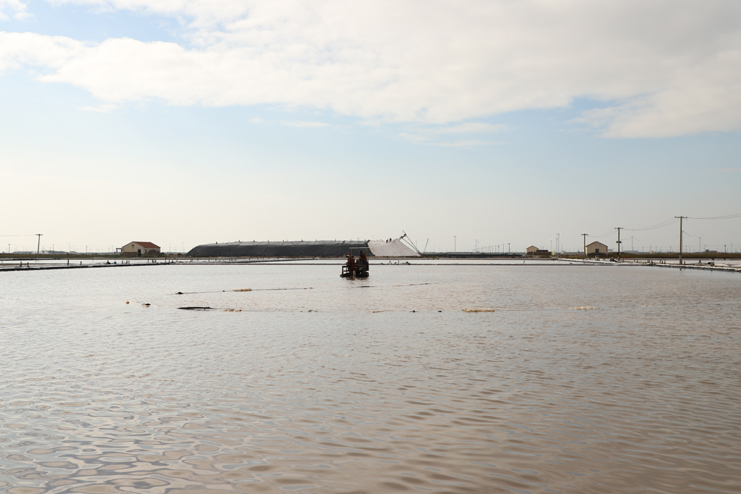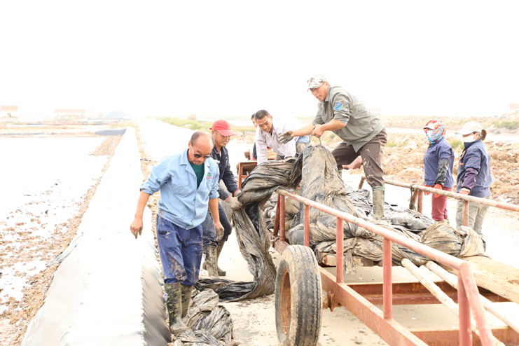 6日下午,在新河制鹽分公司的十二班,扒鹽機組正在扒鹽,在不遠處鹽池內,集鹽機械正在鹽池內緩緩移動集鹽,鹽泵運轉不停,輸鹽上廩,鹽廩上兩名大廩工正在不停筑廩。鹽池內,有的員工對破碴作業機械進行修理,有的員工在整平扒過鹽的格塊,有的員工在活碴。筆者從該班班長徐正好處了解到,該公司5號就開機扒鹽了,下半年以來,十二班已經扒鹽7000余噸。在新河制鹽分公司的十一班,班長葛高劍正帶領員工裝運大廩布,做好扒鹽的準備工作;在埒南制鹽分公司的九班,機聲隆隆,一名員正開著活碴機械在鹽池內作業,不遠處有幾名員工正用土工布叉格埝,對灘場進行維修亮化;八班有一臺挖掘機正在鹽廩旁給裝鹽車輛上鹽……,日曬制鹽公司鹽灘上到處都活躍著職工們忙碌的身影。