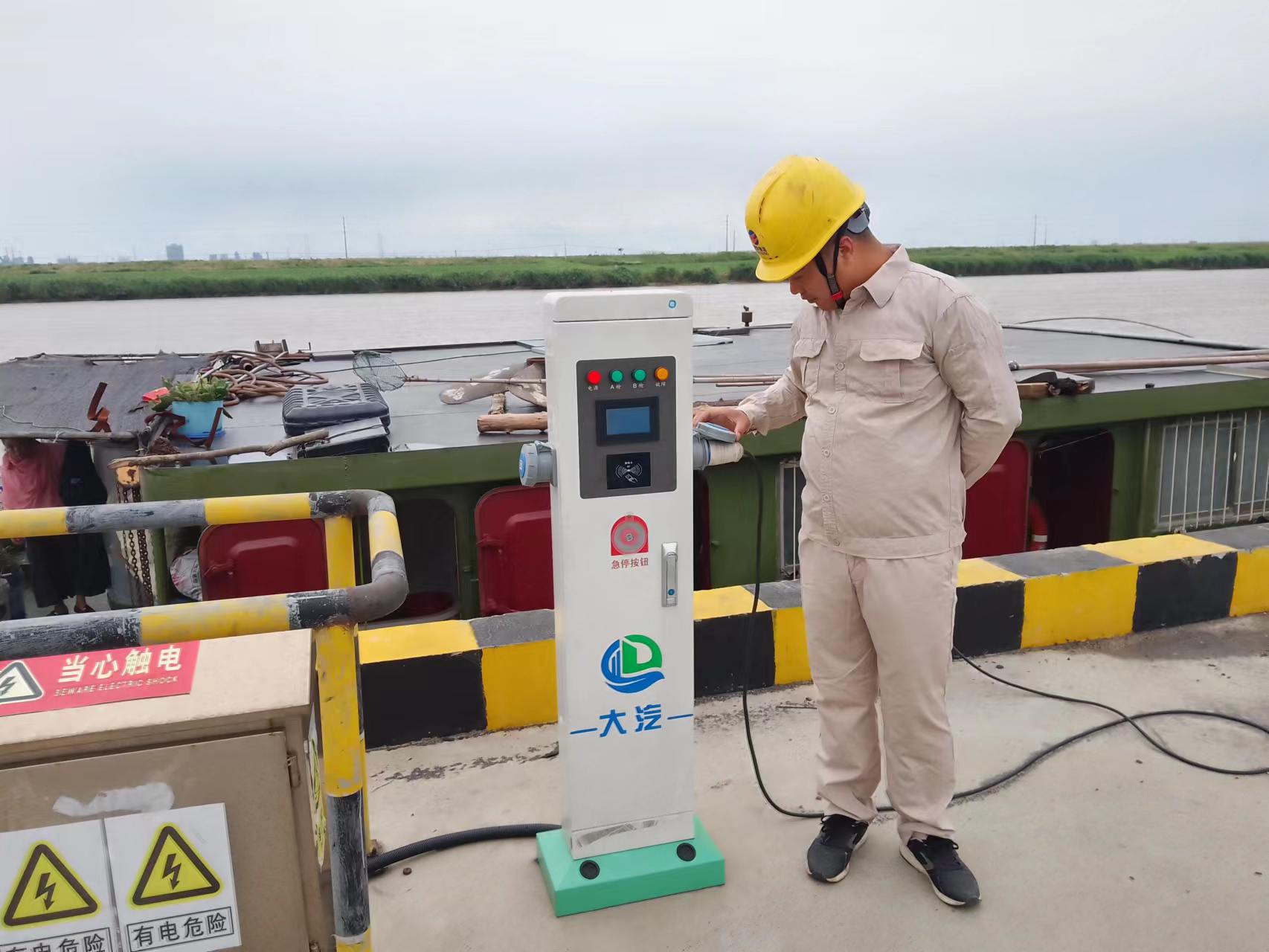 為了方便船只用上綠色環保電,宵洋物流公司在岸電基礎上進行升級改造,投資4萬余元,安裝5個岸電配電系統,以替代柴油發電,從而降低船只??繒r間,消耗廢氣排放和嗓聲污染,每個電樁上帖有操作說明書和注意事項等溫馨提示。接上專用電源,插入岸電接口,掃碼啟動即可使用,安全高效,降低安全隱患。