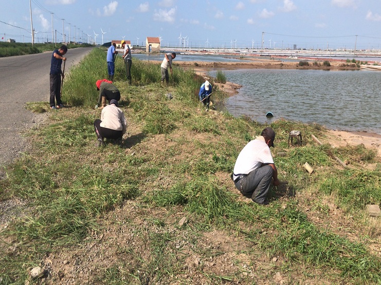埒南制鹽分公司開展灘場文明建設,對各班灘場文明進行集體整頓。完成塑料布整理、清理溝道、值班室整理、鹵臺雜物清除等工作,主要是清理灘內雜物雜草,對值班室、大小機房附近雜草進行清理。并對扒鹽機械進行統一保養、擺放,為即將到來的秋扒奠定基礎。圖為工人正為灘內雜草進行清理。(孟然)