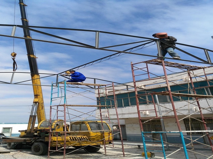 自4月初承接我場中二圩愛心市場大棚制作任務后,機電服務公司班子認真進行研究制作方案,購買優質材料,合理安排技術人員進行制作,做到多頭并進,加班加點,勞模王緒華、星級員工程洪連身先士卒,其他員工積極參與,到4月19日,全面、安全完成制作安裝任務。(圖為現場施工中)(胡亞東)