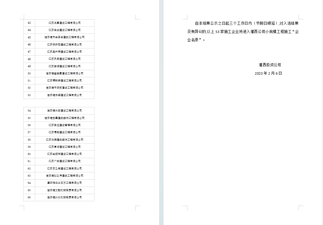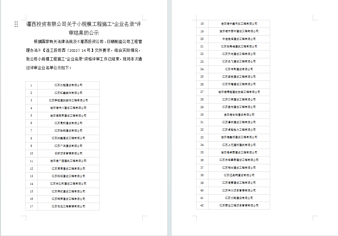 灌西投資有限公司關于小規模工程施工“企業名錄”評審結果的公示