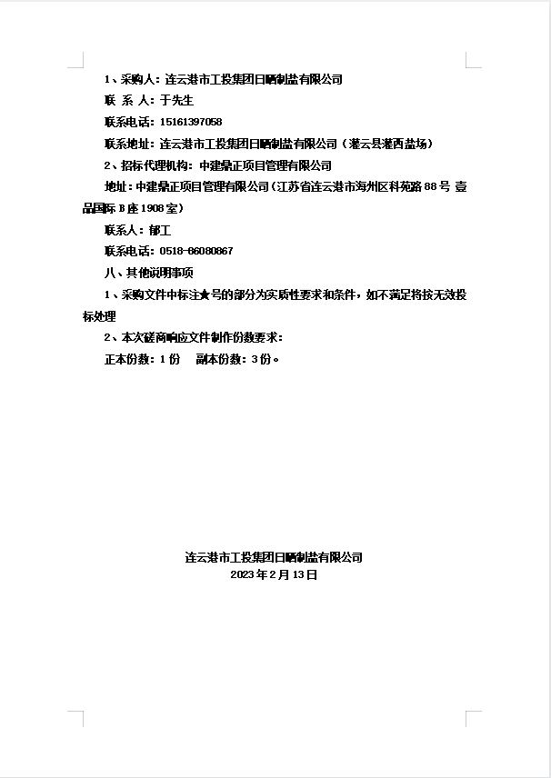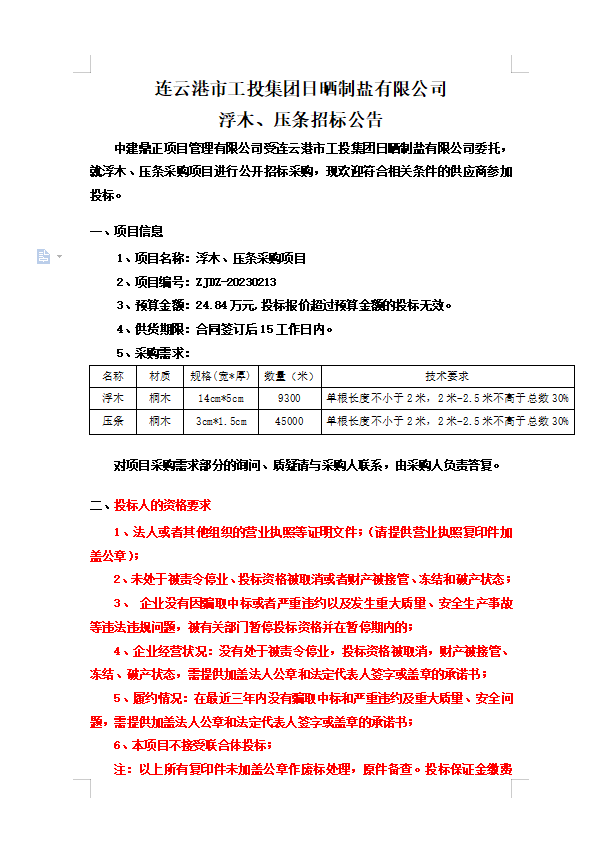 連云港市工投集團日曬制鹽有限公司浮木、壓條招標公告
