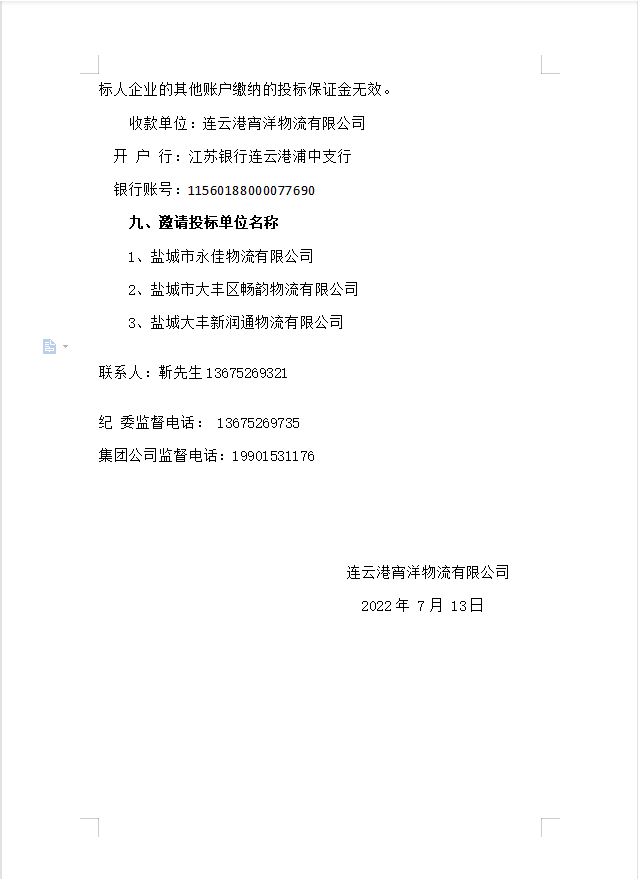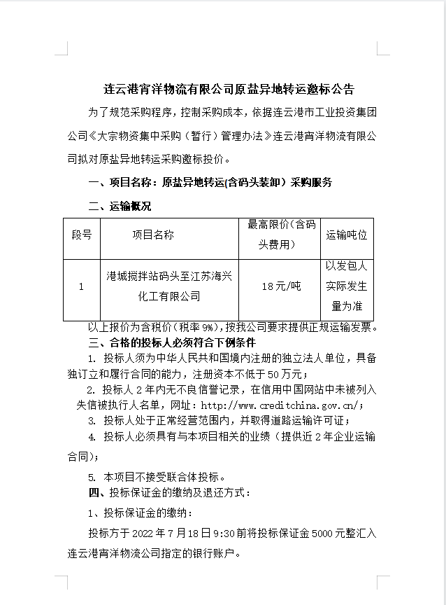 連云港宵洋物流有限公司原鹽異地轉運邀標公告
