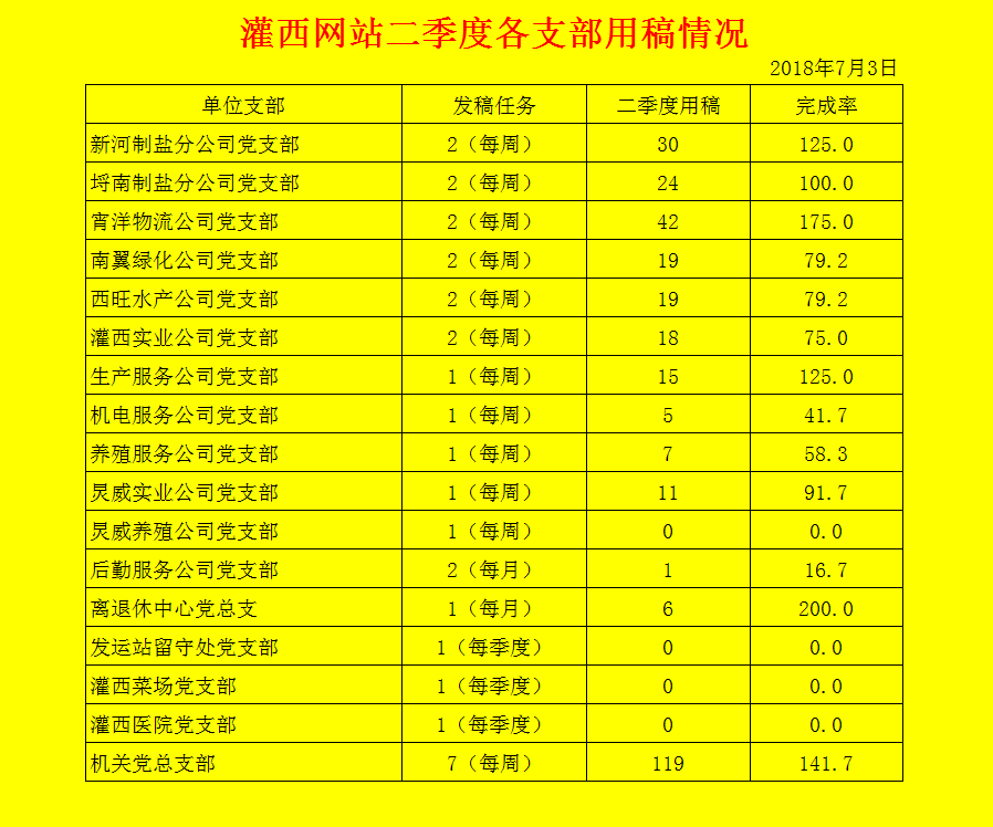灌西網站二季度各支部用稿情況