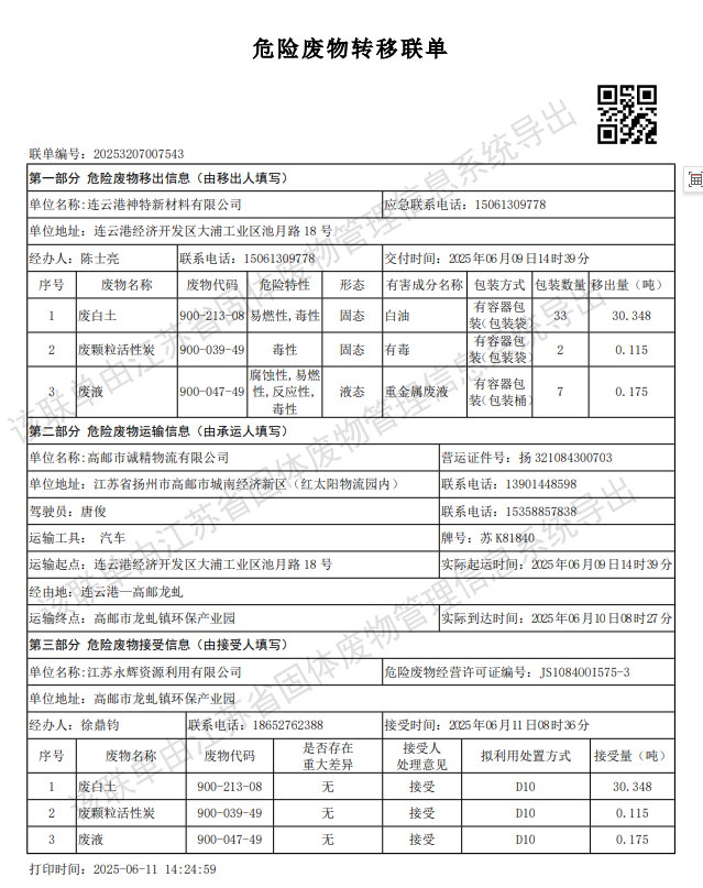 神特公司2025年第二季度危廢處置情況公示