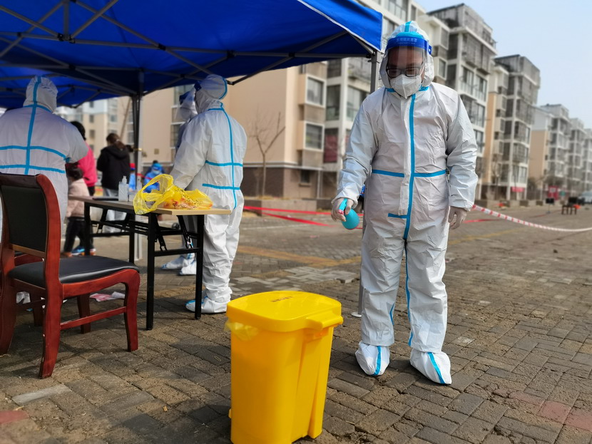 清晨6點30分,1號檢測點,李明同志在檢查物資,“大白”服裝4套、“小藍”服裝6套、棉簽600根……;2號檢測點,于洪亮在將物資上桌,病毒核酸檢測試管、棉簽、消毒液,“還缺少一瓶酒精,我立即反饋給社區,請社區抓緊安排送來”;4號檢測點,蘇玲、秦黎明正在互相幫忙穿好防護服,“秦姐,這個防護面罩里外有兩層薄膜,我給你撕掉,這樣就不會有霧氣了”,“嗯嗯,你這個拉鏈得拉到頂,我們自己也一定要做好防護”秦黎明溫柔的說;5號檢測點,內退黨員孫芳和姜海洋,互相在防護服后背寫上對方的名字,以便于更高效的完成檢測工作;6號檢測點,霍正鋼、朱文健、韓永剛、邱榮濱正在清點檢測小卡片;7號檢測點,張強在拿著酒精給廢物處置垃圾箱消毒;8號檢測點,新加入的孫銀、占恒春、尹永明、韓永光、趙紹慶正在給消殺噴霧劑灌裝84消毒液,社區8個檢測點的消殺工作全部由昌圩臨時黨支部志愿者負責。