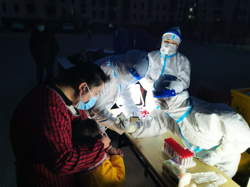 ▲昌圩社區臨時黨支部黨員志愿者與醫護人員一起工作到深夜