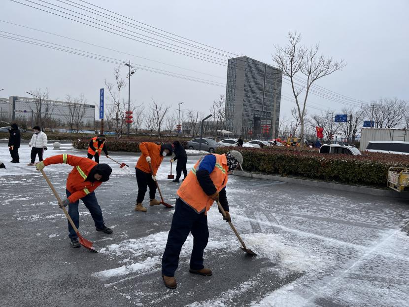 ? ? “風雪無情 志愿有愛”?;顒又?,大家不顧凜冽寒風,積極除雪、干勁十足,有的用鐵鍬鏟除冰塊,有的用掃帚清掃積雪。鐵鏟、掃帚與地面的摩擦聲此起彼伏,譜寫了悅耳動聽的清脆樂曲。志愿者一鐵鍬、一笤帚將積雪推至路邊,經過連續奮戰,園區內路面積雪得到及時清理,通行逐漸恢復順暢。