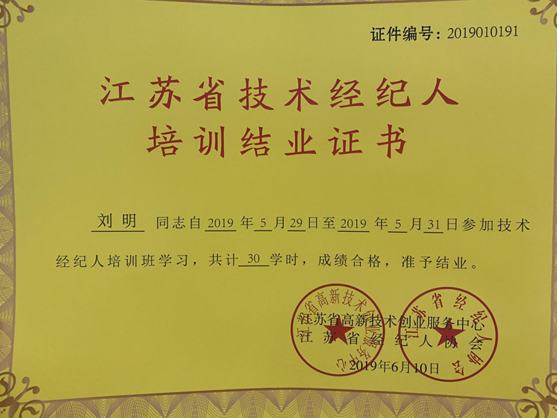 為提高公司服務質量、豐富公司人才類型,美多利公司組織員工參加了江蘇省經濟技術經紀人培訓課程并獲得了培訓結業證書。